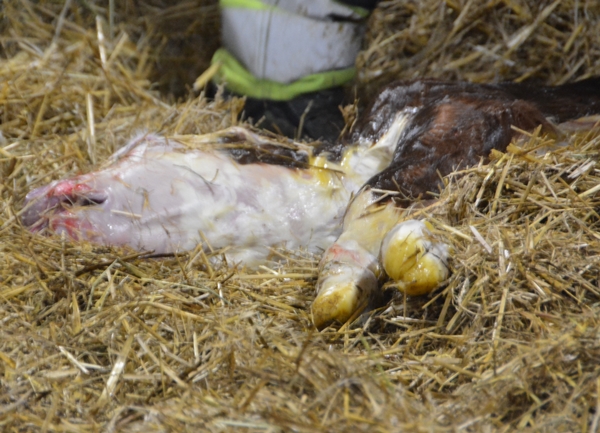 Når det først setter ordentlig igang, da går det veldig raskt. Bare et par rier til så er kalven helt ute.