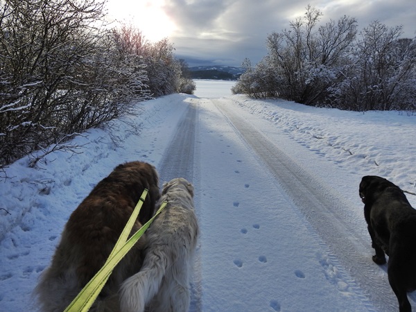 Det var overraskende mye snø nedover veien der. Jeg hadde regnet med holke, men det var mer snø enn is. Vi var skodd med piggsko og det var ingen ulempe. Hadde tatt med andre sko i bilen, da jeg hadde tenkt meg innom butikken på veien hjem.