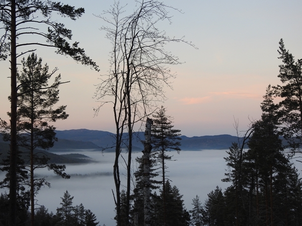 Nydelig kveldshimmel over tåkehavet som ligger som et lokk over dalen.