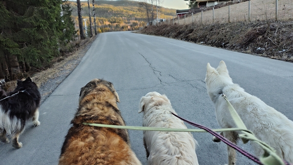 Vel nede fra hogstfeltet så havnet hundene i bånd igjen. Greit det når man potensielt både kan møte folk og biler.