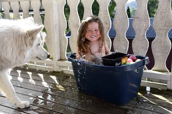 Det var ikke få liter som ble sprutet og sølet ut på verandaen. Jeg fylte på minst ei bøtte før hun var ferdigbadet.