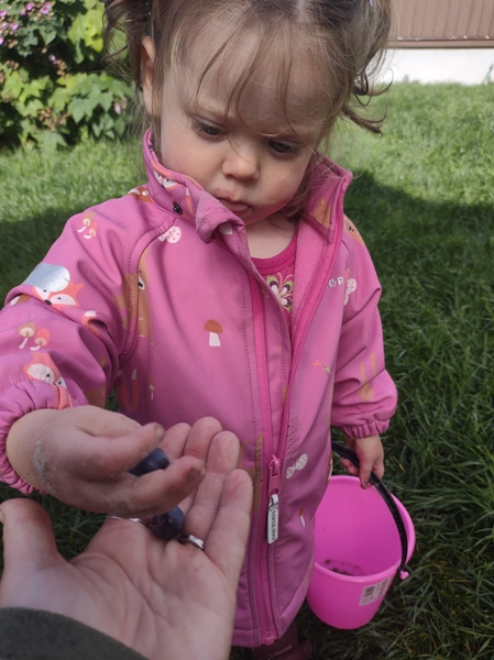 Når vi kom hjem så var det noen små regndrøpp i lufta, men Sofie hadde lyst til å leike i grusen. Da var det bare å finne fram bøtte og spade, så tuslet vi bortover veien til grushaugen.